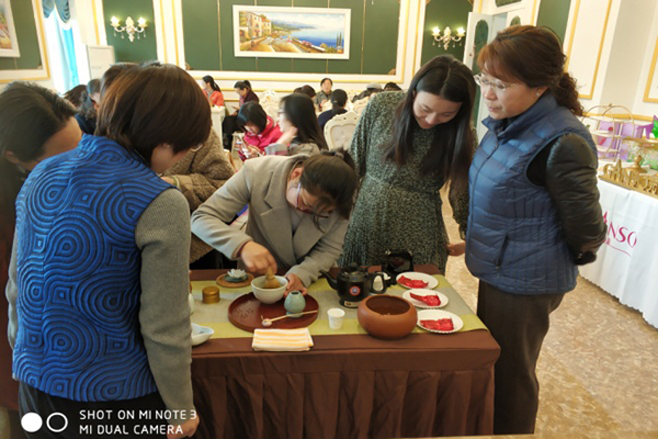 37日的茶道体验活动在西餐厅实训室开展,来自校内各部门、学院的四十多位女教师齐聚一堂,品茶之余畅谈工作和生活。商务日语教研室的张玉霞老师为到场的女教师们生动讲解了茶艺的常识与技巧,现场茶香阵阵、笑语盈盈。商务日语教研室的女教师们还精心准备了日本茶道用具,为大家演示抹茶的冲泡方法,女教师们跃跃欲试,兴致勃勃地参与其中。杨雪琴副校长也应邀到场,亲切慰问了女教师们。