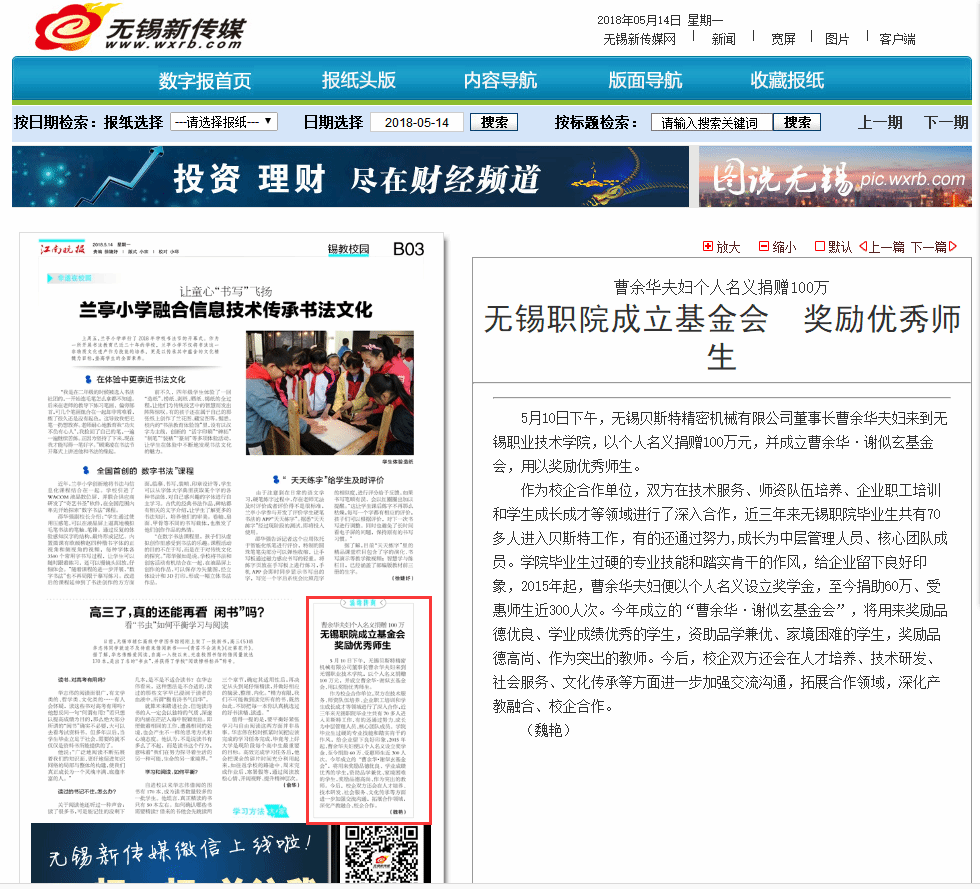 【江南晚报】曹余华夫妇个人捐赠100万 无锡职院成立基金会奖励优秀师生