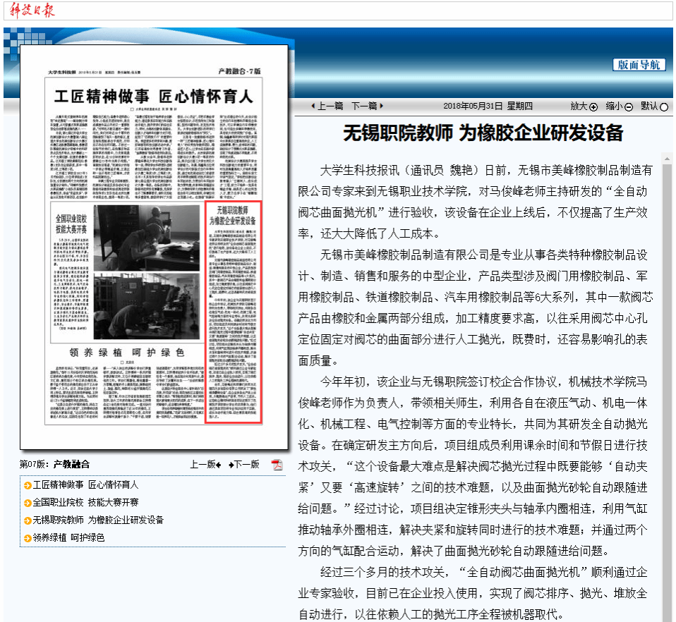【大学生科技报】无锡职院教师 为橡胶企业研发设备