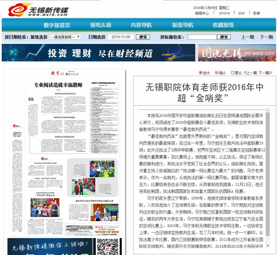 【无锡日报】无锡职院体育老师获2016年中超“金哨奖”