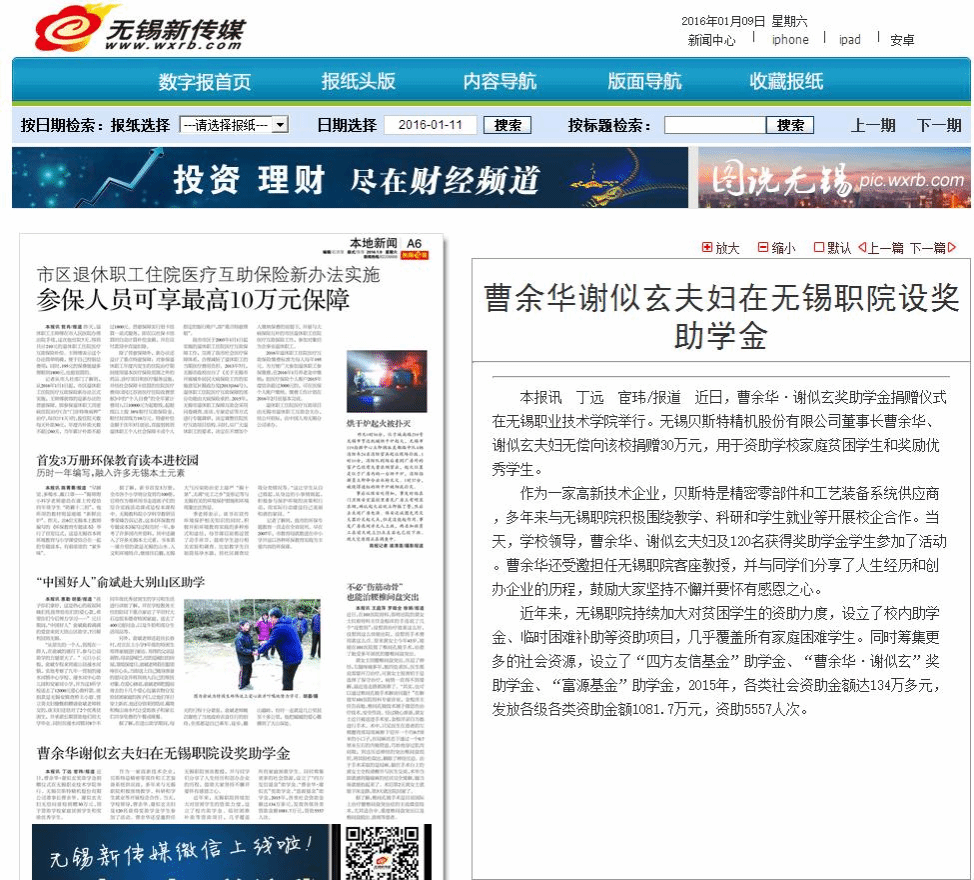 【无锡商报】曹余华谢似玄夫妇在无锡职院设奖助学金