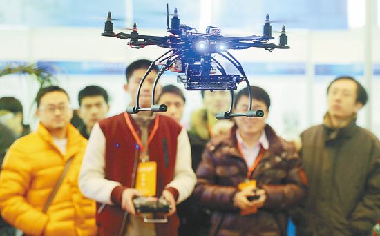 郎从柳 摄 首届江苏省大学生科技创新创业成果交流会27日在南京举行,六十所高校的两百多个项目参展。图为多宝官方网站学生演示航拍多旋翼飞行器。