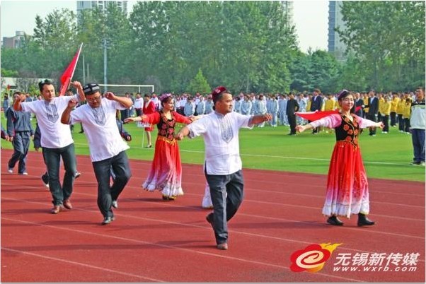 27-28日,多宝官方网站举办一年一届的田径运动会。开幕式上,来自新疆对口支援城市霍城的“新疆班”同学们,以载歌载舞的形式列队入场。获得一片掌声。(郁飞 汪自力/摄)