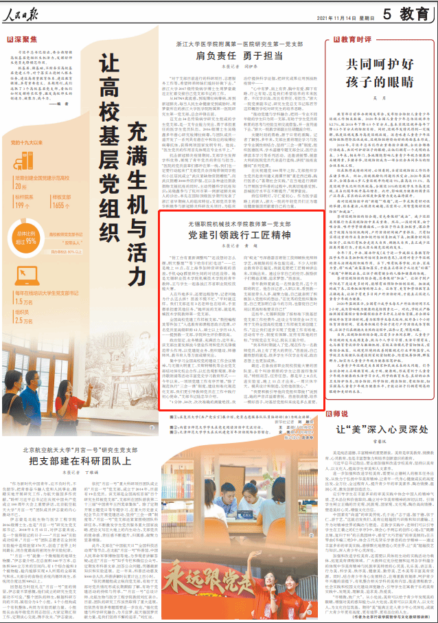 集中学习全国高校党的建设工作会议精神,与无锡大明重工、贝斯特精机等企业党支部结对深化校企合作,以红色观影观展、革命诗歌朗诵等活动丰富党史学习教育形式……今年以来,一项项党建工作有序开展。“除了规范执行‘三会一课’制度,建设标准化规范化支部,我们更引导教师党员在工作中践行初心使命。”支部书记陆忠华介绍。