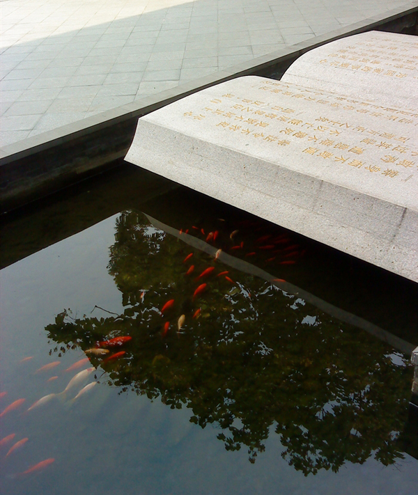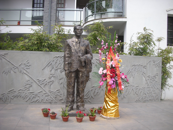 走进陈列馆大门,600多平方米的庭院广场上,王选铜像扑入眼帘。广场一角,池塘中《汉书·晁错传》中一段对王选一生产生重要影响的文字,以石刻书本的形式展现。